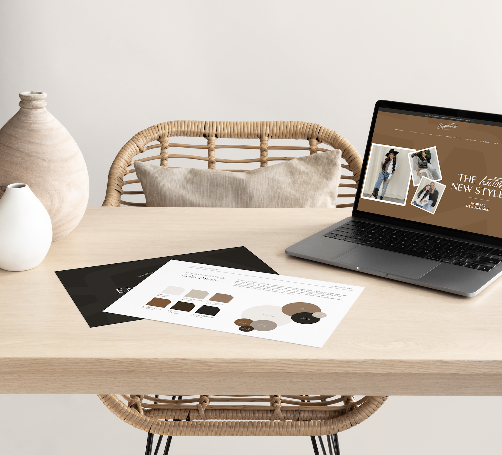 English Rose Boutique is a modern women’s clothing boutique built around effortless style, neutral tones, and timeless wardrobe staples. The goal of the project was to create a brand identity that felt elevated yet approachable, blending modern minimalism with warm, lifestyle-driven storytelling.