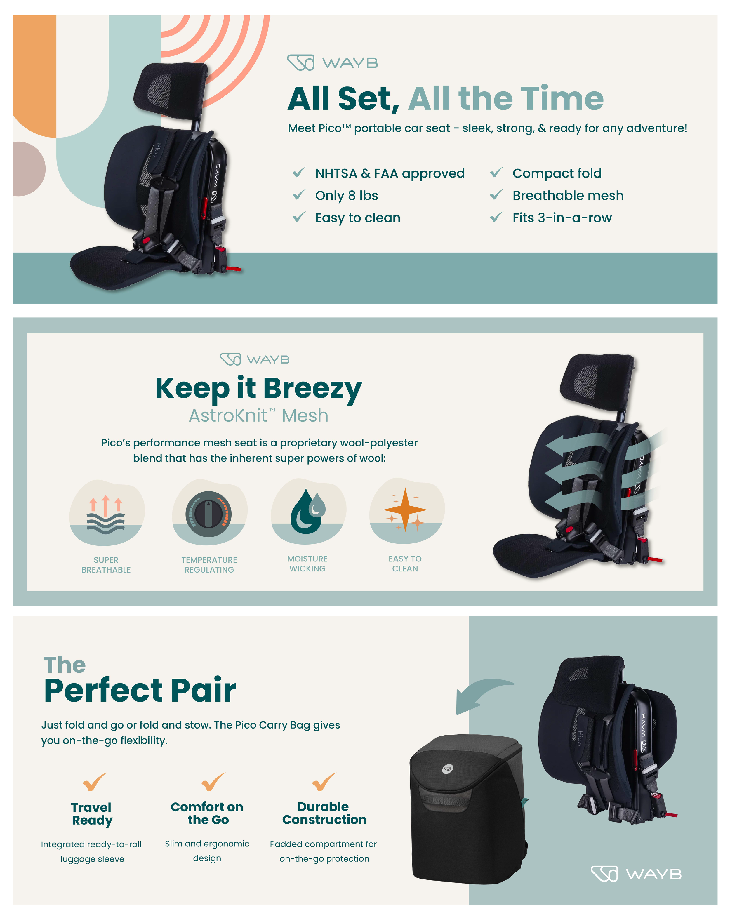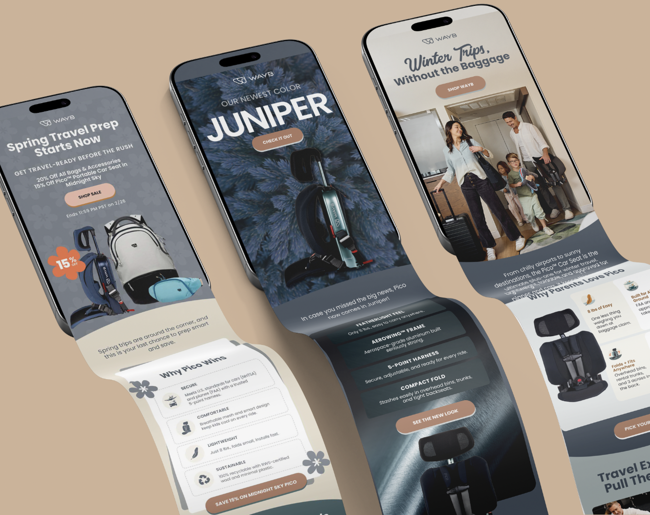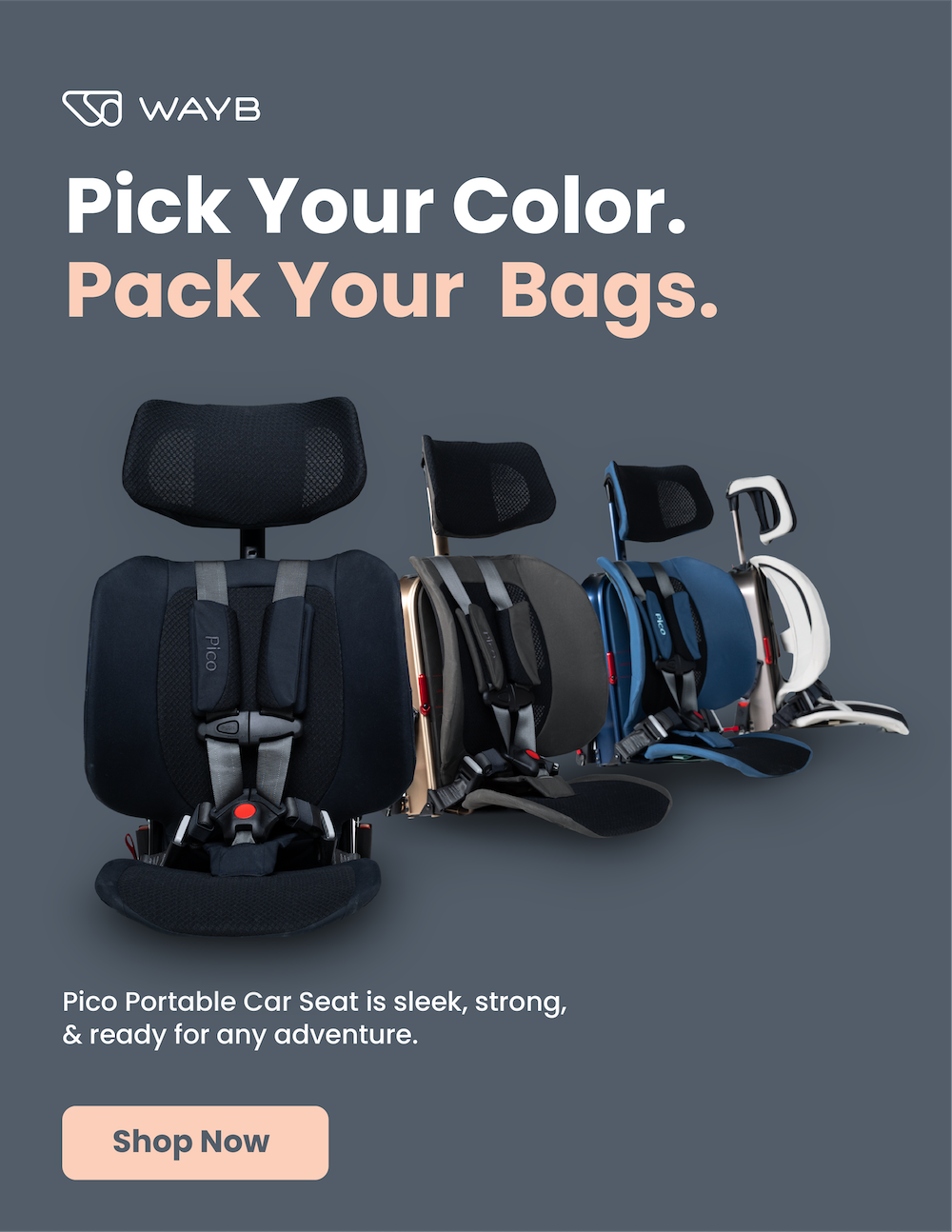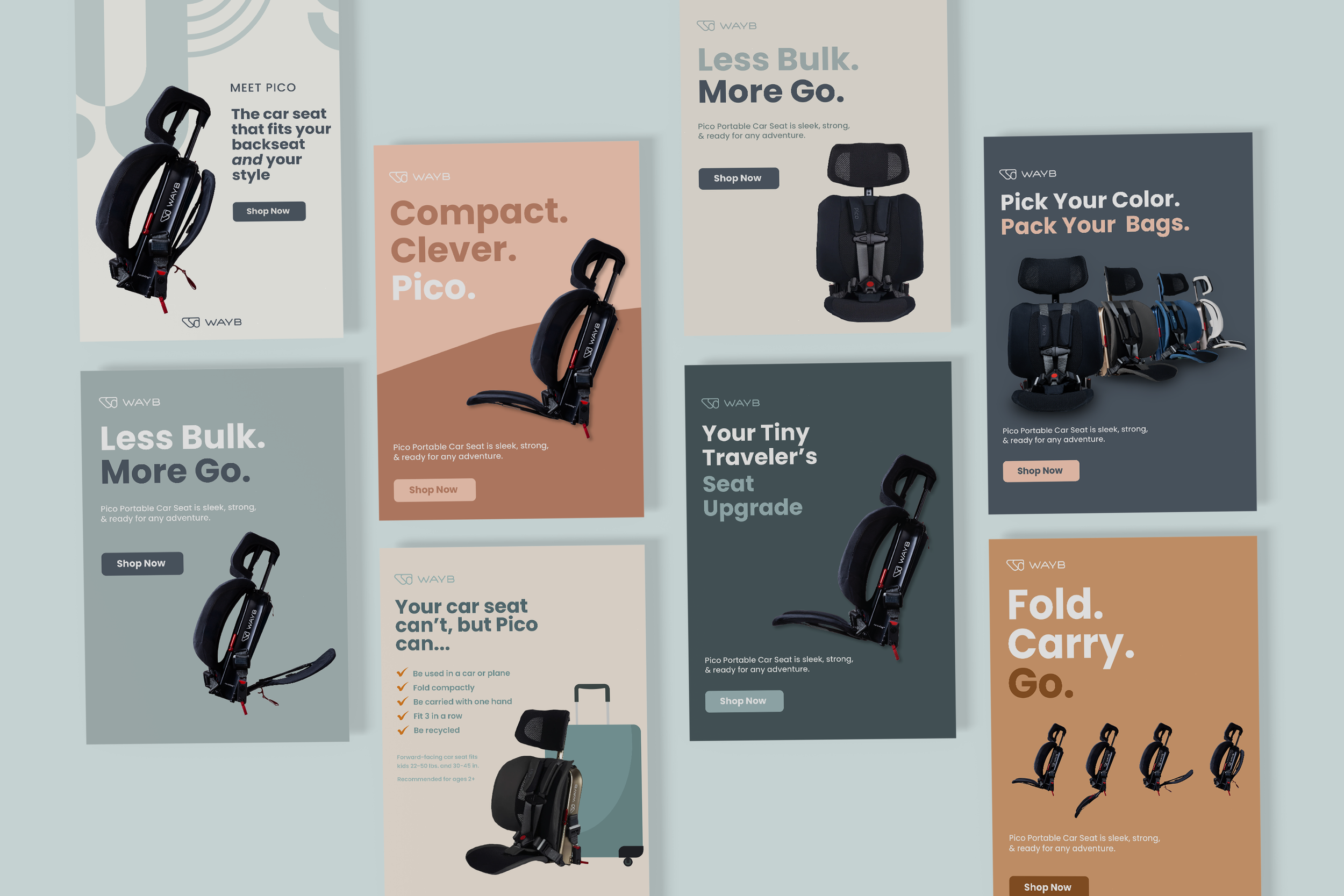 WAYB is a modern travel gear brand best known for the Pico, a lightweight, foldable car seat designed for families on the go. As a Senior Designer, I helped evolve the WAYB visual identity and developed a cohesive brand system across marketing campaigns, e-commerce, packaging, and digital advertising.
