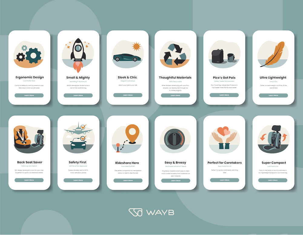 To create a more recognizable and scalable brand presence, I developed a custom illustration system for WAYB. The goal was to communicate product benefits in a playful but informative way while maintaining the brand’s modern aesthetic.